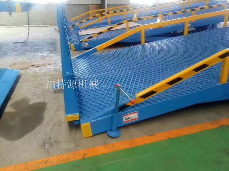 登車橋分為固定式、移動(dòng)式兩種,采用國產(chǎn)/進(jìn)口液壓系統(tǒng)。它的主要作用是在貨臺(tái)與運(yùn)輸車輛之間搭起一座橋,使叉車便利地行駛,達(dá)到高效裝卸貨目的。該設(shè)備一端與貨臺(tái)等高,另一端搭在車廂后沿,并能根據(jù)不同的車型及裝車過程中車廂的高低變化,自動(dòng)調(diào)整高度。該產(chǎn)品可根據(jù)用戶的不同需要,在外形尺寸、承受載荷等方面特殊設(shè)計(jì)。